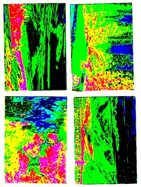 My scanner's backplate is a nearly black, textured piece of plastic. It's not the ideal surface to recognize, since photos can occasionally contain quite similar-looking regions, but it's possible. I recognize backplate in a small patch based on the patch's mean gray level (dark), pixel variance (fairly large), and color content (very little). The output of the filters for each of these three properties are shown in the red, green, and blue channels of the "detectors" image, below. Even though none of these filters are very good individually; they tend to fail in different locations, so by requiring all the detectors to agree (by taking the product of their outputs), I get the nice result shown in "classified".