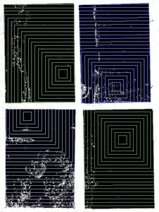 Now that I can reliably separate foreground (pictures) from background, I need to find the boundaries of and extract each picture. I used a simple region-growing approach, where I drag around the corners of a quadrilateral. By pulling out corners that lie on foreground parts of the image, and pushing in corners that lie on background parts of the image, I can occasionally grab an entire photo. By throwing out regions that have an unreasonable size, bad aspect ratio (far from 3:2), or non-square corners, I eventually end up covering all the pictures in the scan. See "Regions", below.