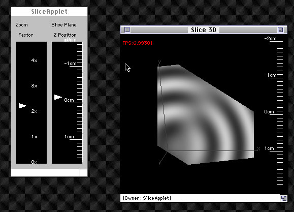 The images have rulers which display millimeter distances, matched to the zoom factor. If the user drags the mouse inside the image window (labeled "Slice 3D") the block of data rotates beneath the mouse. If the user clicks the mouse in the image window, the program computes the 3D coordinates (in millimeters) of the clicked point on the slicing plane, and writes them to standard output. These coordinates could then be captured to a file and passed to another program for further analysis (e.g., for MRI geometric calibration, estimating the volume of a lesion, or planning a minimally harmful path for radiation treatment).